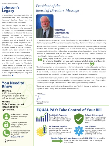 Johnson: Continued from page 1 commitment dedication information. verify or update your Log into MyMeter to happens. you when an outage Make sure we contact (913) 573-9190 the phone. to make updates over Or call Customer Service and | WINTER 2024 2 up-to-date. information is Only if your contact ANSWER: will we be able to call you? disruptions in your area, If BPU has outages or QUESTION: Know You Need to his departure. to drive progress and prosperity long after a fr